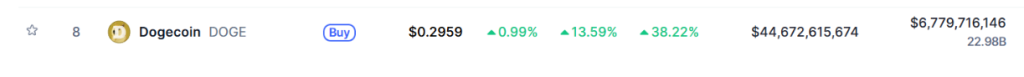 (Der Kurs von $DOGE ist in den letzten 24 Stunden um mehr als 13 Prozent angestiegen – Quelle: coinmarketcap.com)