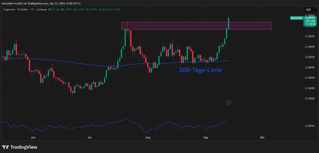 Die Auswirkungen der Hoffnungen auf den neuen $DOJE-ETF sind bei $DOGE bereits stark im Chart sichtbar. Nicht nur, dass sich der Kurs im September oberhalb der 200-Tage-Linie stabilisiert hat, die der wichtigste gleitende Durchschnitt in der technischen Analyse ist. Auch das Momentum ist stark angestiegen, wie auch an der starken Aufwärtskurve im Momentumindikator von Tradingview erkennbar ist. Seit dem Tiefpunkt am 1. September ist der Kurs von $DOGE dabei um mehr als 44 Prozent angestiegen. Dabei hat $DOGE heute einen bedeutenden und massiven Widerstand durchbrochen, was die Rallye noch verstärken könnte.