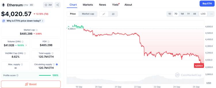 In einem sich zunehmend eintrübenden wirtschaftlichen Umfeld rasselte zuletzt auch der Kurs von ETH in den Keller. Ein Einbruch von 12,27 Prozent innerhalb von nur 7 Tagen rückt die $4.000-Marke wieder ins Blickfeld der Investoren.
