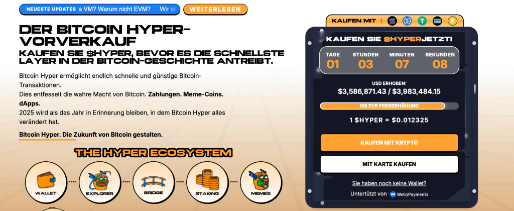 Während Ethereum langsam aber sicher auf ein neues Allzeithoch zusteuert, sorgt ein neues Projekt mit revolutionärem Ansatz für Aufsehen. Die Rede ist von Bitcoin Hyper. Die Layer-2-Lösung auf Solana-Basis bringt Bitcoin-Investoren erstmals Zugang zu DeFi-Anwendungen, inklusive Lending, Staking, Yield Farming und schnellen Transaktionen.