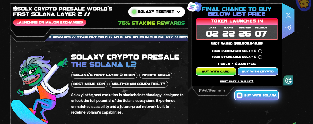 Im Mittelpunkt steht der $SOLX-Token, der aktuell noch im Vorverkauf erhältlich ist. Bereits jetzt wurden über 55 Millionen Dollar in den Token investiert, womit Solaxy schon alle Rekorde bricht und eines der erfolgreichsten ICOs in der Krypto-Geschichte durchführt. Die hohe Nachfrage während des Vorverkaufs deutet darauf hin, dass die Entwickler einen Nerv treffen und Solaxy einer der vielversprechendsten Altcoins in diesem Jahr werden könnte. Eine Kursexplosion um mehr als das 10-fache wäre nach dem Handelsstart an den Börsen keine große Überraschung.