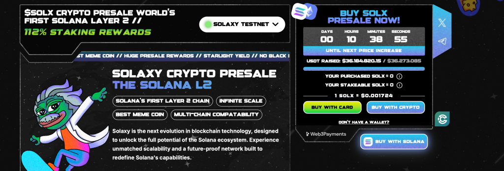 Derzeit befindet sich $SOLX noch im Presale, was Anlegern die Möglichkeit gibt, frühzeitig zu einem günstigen Fixpreis einzusteigen. Die Nachfrage spricht bereits für sich. Über 36 Millionen Dollar wurden in kürzester Zeit investiert, obwohl der Coin noch gar nicht an den Kryptobörsen gehandelt wird.