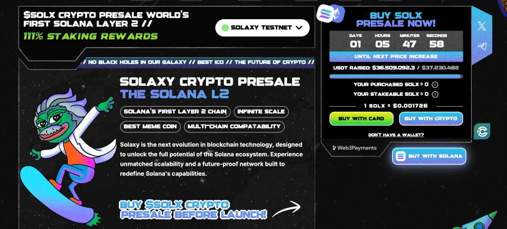 Die Begeisterung ist groß. Schon jetzt wurden Token im Wert von über 36,5 Millionen Dollar gekauft, noch bevor $SOLX überhaupt an den Börsen gelistet ist. Analysten halten deshalb eine Kursexplosion nach dem Listing für sehr wahrscheinlich. Einige Experten vergleichen Solaxy bereits mit Ethereum-Layer-2-Projekten wie Arbitrum oder Optimism, die sich innerhalb kurzer Zeit zu Milliardenprojekten entwickelt haben. Passiert das auch bei Solaxy, können sich Anleger über Renditen von über 1.000 % freuen.