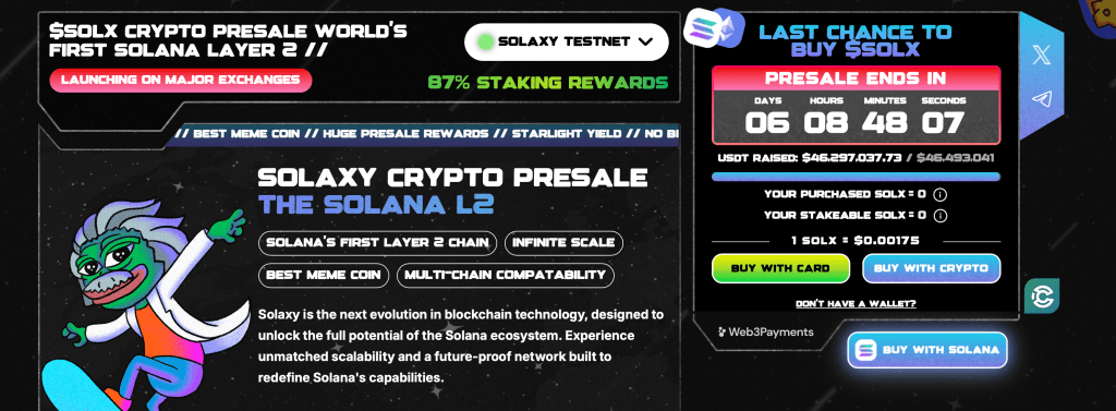 Während Ethereum sich auf die nächste Kursverdopplung vorbereitet, könnte Solaxy ein ganzes Stück weiter springen. Analysten halten hier ein x10 oder mehr für möglich. Das liegt daran, dass sich Solaxy zu einem der wichtigsten Projekte im Solana-Ökosystem etablieren könnte. Solaxy will die Stabilität der Solana-Blockchain verbessern.
