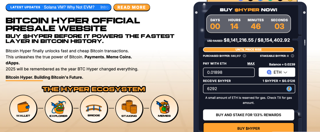 Das Interesse an Bitcoin Hyper ist enorm. Die $HYPER-Token sind derzeit noch im Vorverkauf erhältlich und schon jetzt haben Anleger über 8 Millionen Dollar investiert, um noch vor dem Listing an den Börsen einzusteigen. Der Tokenpreis wird stufenweise erhöht, wodurch frühe Käufer schon erste Buchgewinne mitnehmen können. Sollte sich die Lösung als Standard im Bitcoin-DeFi-Bereich etablieren, sehen Analysten die Chance auf einen Milliardenmarkt, mit potenziellen Renditen von mehreren tausend Prozent für frühe Investoren.