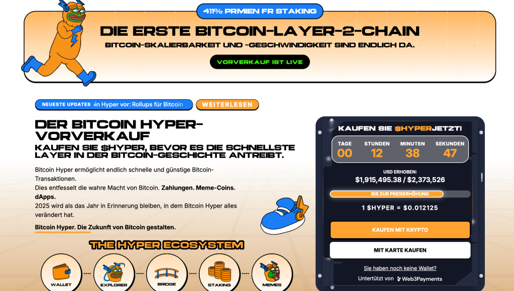 Analysten sehen in Bitcoin Hyper ein Projekt mit enormem Potenzial. Einige gehen davon aus, dass der Kurs nach dem Börsenstart um mehr als 1.000 % zulegen könnte, nicht zuletzt, weil viele Käufer ihre Token staken und damit langfristig binden. Das reduziert den Verkaufsdruck nach dem Launch und erhöht die Chance auf eine echte Kursexplosion. Wer früh dabei sein will, hat jetzt noch die Chance vor dem Börsenlisting zum günstigen Fixpreis einzusteigen.