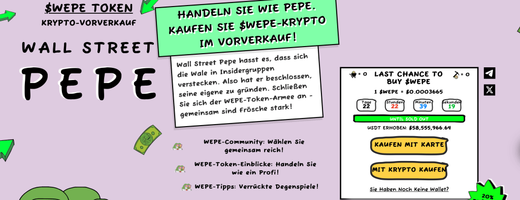 Während es bei einigen Top 20 Coins tatsächlich schwierig wird, nochmal neue Allzeithochs zu sehen, dürfte Wall Street Pepe seine besten Tage erst vor sich haben. Der Meme Coin, der an $PEPE angelehnt ist, legt derzeit das erfolgreichste Initial Coin Offering (ICO) aller Zeiten hin. Innerhalb kürzester Zeit haben Anleger fast 60 Millionen Dollar investiert, obwohl der Coin noch gar nicht an den Kryptobörsen handelbar ist.