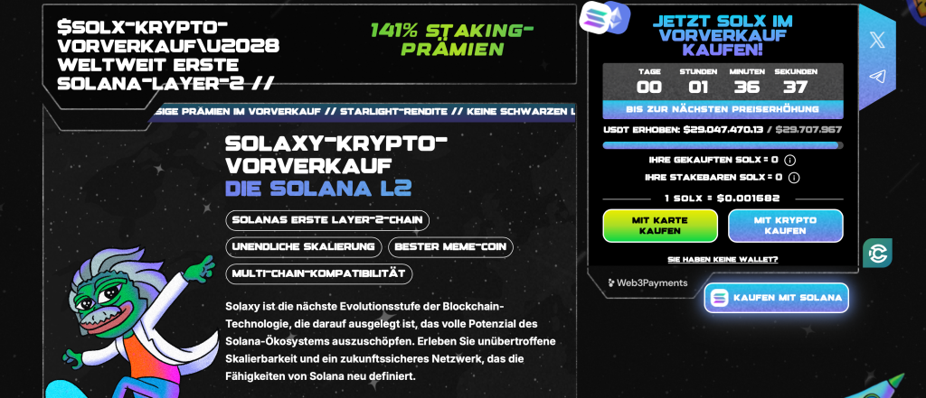 Solaxy kommt mit dem neuen $SOLX-Token, der aktuell noch im Vorverkauf erhältlich ist und das Zentrum des neuen Solaxy-Ökosystems bildet, wenn schon bald zahlreiche neue Token und dApps auf der neuen Layer 2 gelauncht werden. Die Nachfrage ist schon jetzt extrem hoch, sodass Anleger bereits über 29 Millionen Dollar investiert haben, um von Anfang an dabei zu sein. Analysten vermuten daher, dass der Kurs nach dem Launch schnell durch die Decke gehen und um ein Vielfaches steigen könnte.