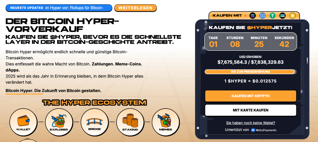 Bitcoin Hyper entwickelt eine Layer-2-Lösung, mit der Bitcoin-Nutzer erstmals Zugang zu DeFi- und Staking-Anwendungen erhalten sollen. Möglich wird das, weil die neue Layer 2 auf Solana basiert, sodass Anleger, die ihre Coins bridgen, sämtliche Vorteile des Solana-Ökosystems nutzen können. Das Konzept schlägt hohe Wellen, da es den Kryptomarkt für immer verändern und Bitcoin völlig neue Möglichkeiten verschaffen könnte. Entsprechend hoch ist auch die Nachfrage nach dem dazugehörigen $HYPER-Token. Der Token befindet sich noch im Presale und hat bereits über 7,6 Millionen Dollar umgesetzt, noch bevor er auf einer Börse gelistet wurde.