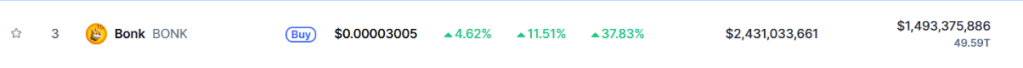 (In den letzten 24 Stunden ist der Kurs von $BONK um mehr als 11 Prozent explodiert – Quelle: coinmarketcap.com)
