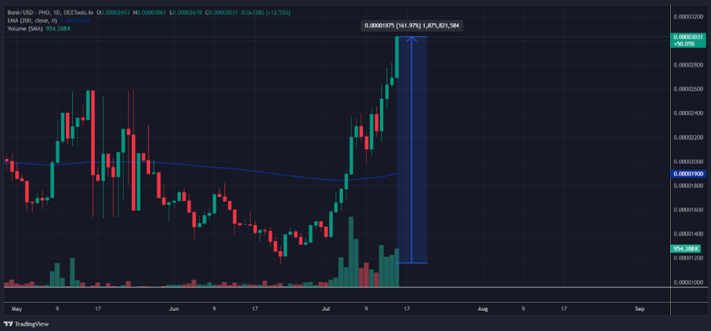 Seit dem Start der Rallye am 22. Juni ist der Kurs nicht nur über den bedeutenden gleitenden Durchschnitt EMA 200 gestiegen, sondern legte eine beeindruckende Rallye mit über 160 Prozent Kursgewinn hin. Zeitgleich ist das Volumen explodiert, was ein deutliches Zeichen für einen nachhaltigen Anstieg ist. Und der Kurs könnte noch deutlich höher steigen, denn offenbar gibt es jetzt großes Interesse vonseiten institutioneller Investoren an $BONK!