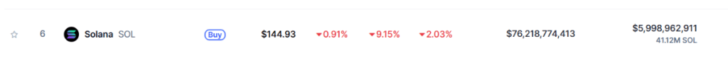 (Der Kurs von Solana ist infolge des Angriffs der israelischen Armee um mehr als 9 Prozent eingebrochen – Quelle: Coinmarketcap.com)