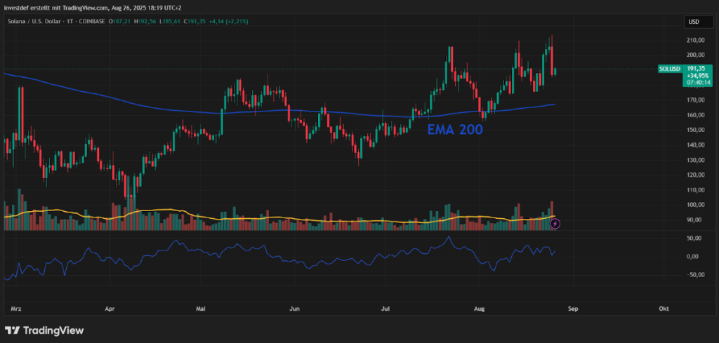 Solana zeigt derzeit trotz der saisonalen Schwäche einige starke bullishe Signale im Chart. Zum einen ist der Kurs Anfang August am EMA 200 abgeprallt. Dieser bedeutende gleitende Durchschnitt stellt also eine starke Supportlinie dar. Zum anderen hat sich im Zuge dessen ein kleiner Aufwärtstrend gebildet.