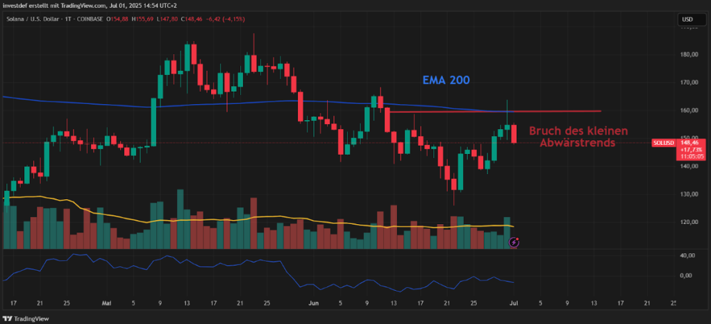 Seit seinem vorläufigen Tiefpunkt der aktuellen Korrektur bei 126,03 US-Dollar, der am 22. Juni gebildet wurde, ging es für den Solana-Kurs wieder um mehr als 30 Prozent bis zum vorläufigen Hochpunkt, der am gestrigen 30. Juni markiert wurde, nach oben. Nach dieser starken Erholungsrallye ist der Solana-Kurs zwar vorläufig am EMA 200, der einen starken Widerstand bildet, gescheitert, allerdings könnte ein Durchbruch nur eine Frage der Zeit sein.