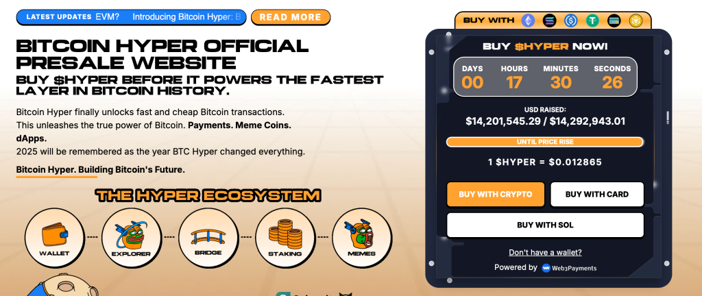 Bitcoin Hyper kommt mit dem nativen Token $HYPER, der aktuell im Vorverkauf erhältlich ist. Da Anleger schon jetzt über 14 Millionen Dollar investiert haben, um noch vor dem Börsenlisting dabei zu sein, gehen Analysten davon aus, dass der Kurs nach dem Börsenstart schnell um ein Vielfaches steigen könnte. Hier könnte sich also eine der seltenen Gelegenheiten ergeben, das eingesetzte Kapital in kürzester Zeit zu vervielfachen.