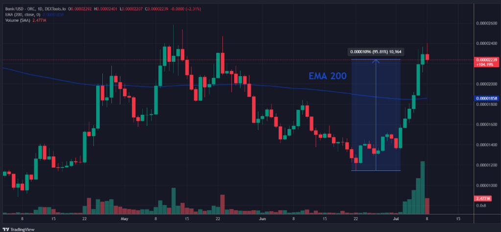 (Die Fantasie über einen möglichen $BONK-ETF hat den Kurs explosiv nach oben getrieben – Quelle: Tradingview.com)