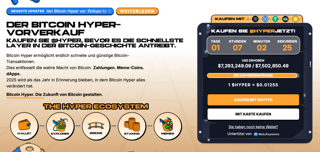 Während Ethereum das Potenzial hat, im Wert zu explodieren, sehen manche Analysten bei Bitcoin Hyper ($HYPER) sogar noch schnelleres Wachstumspotenzial. Das Projekt zielt darauf ab, Bitcoin erstmals vollständig DeFi-fähig zu machen. Über eine Layer-2-Lösung, die auf Solana basiert, sollen BTC-Investoren künftig die Vorteile moderner Blockchains wie Staking, Lending und extrem günstige Transaktionen nutzen können.