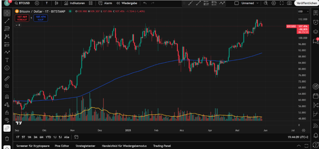 (Der Kurs von Bitcoin ist wieder unter sein ehemaliges Allzeithoch von 109.114 US-Dollar gefallen – Quelle: Tradingview.com)