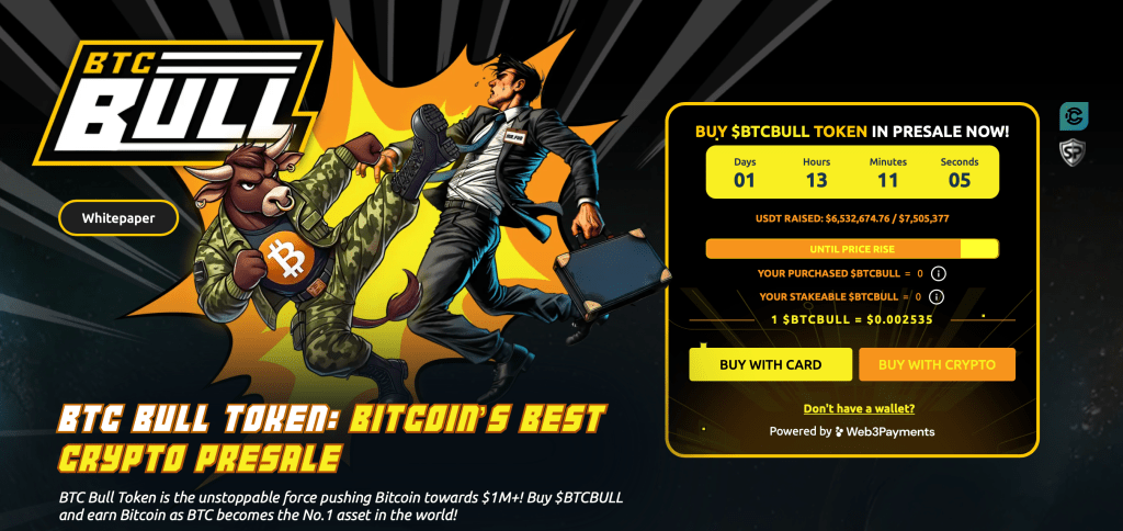 Außerdem dürften die meisten Käufer ihre $BTCBULL-Token langfristig halten, um die Airdrops zu erhalten, wenn Bitcoin die Meilensteine knackt. Damit wären die besten Voraussetzungen für eine Kursexplosion gegeben. Aktuell ist $BTCBULL noch im Vorverkauf erhältlich und schon jetzt explodiert die Nachfrage. Anleger haben bereits über 6,5 Millionen Dollar investiert, um noch vor dem Börsenlisting dabei zu sein, was eine Rallye nach dem Launch umso wahrscheinlicher macht.