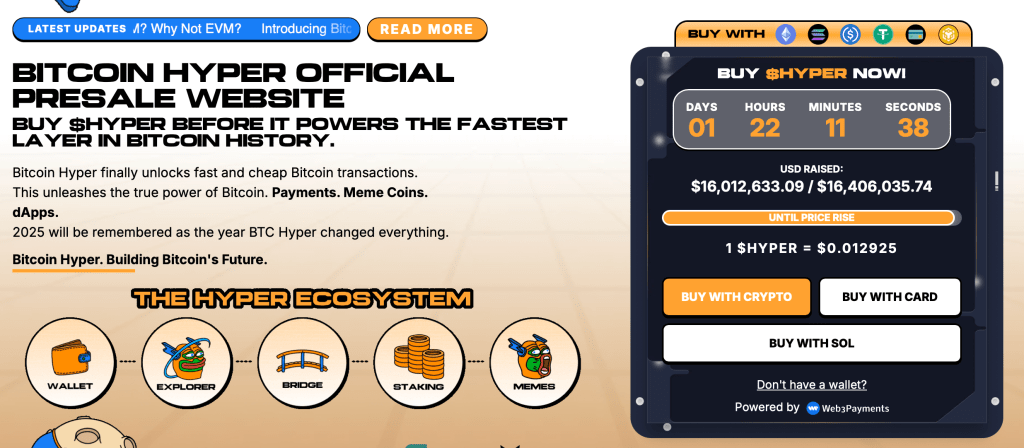 Während Ethereum und Bitcoin auf lange Sicht enormes Potenzial haben, sorgt aktuell vor allem Bitcoin Hyper ($HYPER) für Gesprächsstoff. Das Projekt entwickelt eine Layer-2-Lösung auf Solana-Basis, die Bitcoin erstmals DeFi-fähig machen soll. Nutzer könnten dadurch nicht nur schneller und günstiger Transaktionen durchführen, sondern auch Staking- und Lending-Möglichkeiten für BTC nutzen, was bisher ausschließlich bei neueren Blockchains wie Ethereum oder Solana möglich war.