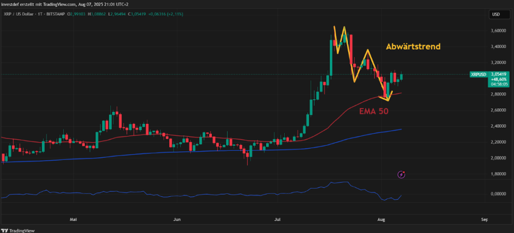 Die Korrektur der letzten Wochen hat den Kurs von $XRP in einen neuen Abwärtstrend gezwungen. Dieser nahm seinen Beginn am 18. Juli, also dem Tag, an dem das neue Jahreshoch von $XRP markiert wurde. Seitdem setzt dieser sich mit steigender Dynamik fort und auch der Momentumindikator von Tradingview ist dabei stark gefallen. Jetzt erholt sich der Kurs von $XRP aber direkt am EMA 50 und hier stellt sich die entscheidende Frage, ob $XRP wieder nach oben laufen und den Trend brechen oder weiter fallen wird.