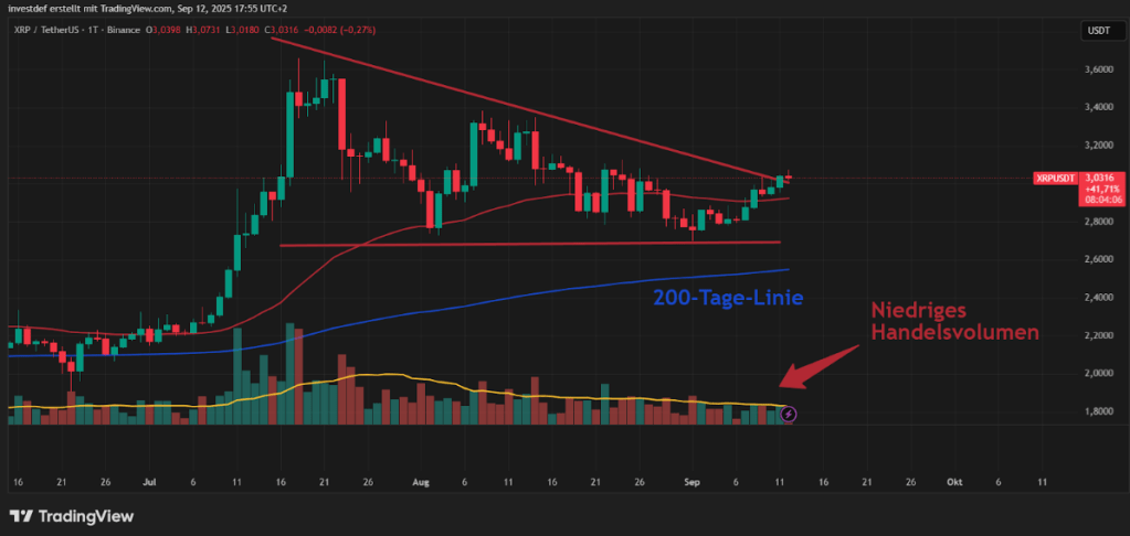 (Der Kurs von $XRP notiert zwar über der 200-Tage-Linie, aber der Ausbruch aus dem bullishen Dreieck erfolgte unter niedrigem Volumen – Quelle: Tradingview.com)