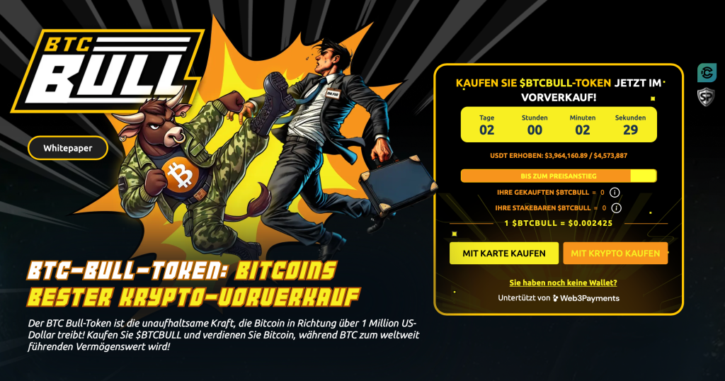 Das Konzept eines Meme Coins, bei dem Anleger gleich doppelt profitieren könnten, kommt offenbar sehr gut an. Obwohl die BTC Bull Token erst seit kurzem im Vorverkauf erhältlich sind, haben Anleger bereits Token im Wert von fast 4 Millionen Dollar gekauft. Damit hat $BTCBULL auch schon eine höhere Bewertung erreicht, als die meisten Meme Coins je erreichen werden, sodass eine Kursexplosion nach dem Launch umso wahrscheinlicher ist. Vor allem, wenn der Bitcoin-Kurs die definierten Meilensteine erreichen sollte.
