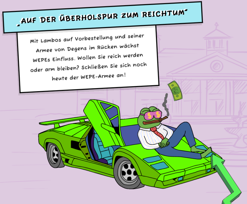 Angesichts der Flut an minderwertigen Memecoins investieren viele Anleger allerdings auch verstärkt Zeit in die Recherche. Welche Memecoins sind vielversprechend, welche punkten mit einem soliden Konzept, welche besitzen bereits eine gewachsene Community und bullishe Prognosen? Mit 57,5 Millionen Dollar gesammeltem Kapital schon jetzt im Olymp der Presale-Memecoins: Pepe Coin Nachfolger Wall Street Pepe (WEPE). Das Projekt kombiniert den Fun-Faktor eines Memecoins mit bullisher Utility – und macht gar keinen Hehl aus seiner Absicht, den Coin auf eine Milliarden-Dollar-Marktkapitalisierung zu heben!
