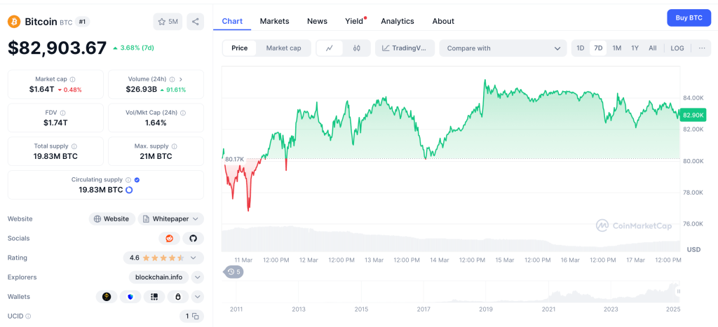 Der Bitcoin-Kurs ist am Montag mit Öffnen der Börsen in Asien kurzzeitig auf 82.000 Dollar gefallen, hat sich jedoch schnell auf ein Hoch von 83.700 Dollar erholt, bevor er sich zum Zeitpunkt des Schreibens bei etwa 83.500 Dollar stabilisierte.