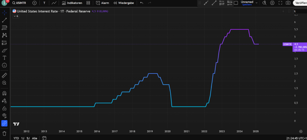 (Die Fed hat die Zinsen diesmal weder gehoben noch gesenkt, weshalb sie bei 4,5 Prozent bleiben – Quelle: Tradingview.com)