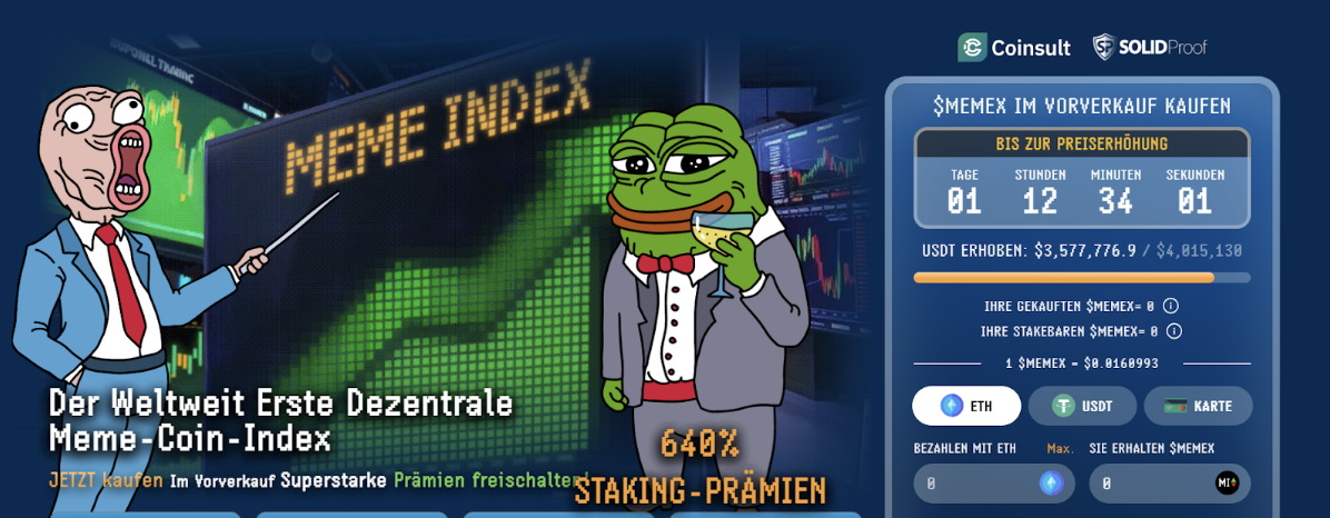$MEMEX es la criptomoneda oficial de Meme Index. Todos los inversores que deseen aprovechar el potencial de los índices de criptomonedas meme necesitan este token en su monedero. En consecuencia, la demanda de esta nueva criptomoneda está creciendo a una velocidad increíble. Aunque $MEMEX todavía se encuentra en preventa, los inversores ya han invertido más de 3,5 millones de dólares para estar presentes desde el primer momento. El precio aumentará varias veces antes del inicio de las operaciones en las bolsas, lo que reportará a los primeros compradores una primera plusvalía. Además, se ha integrado una función de staking, que ofrece una rentabilidad extremadamente elevada durante los primeros 2 años.