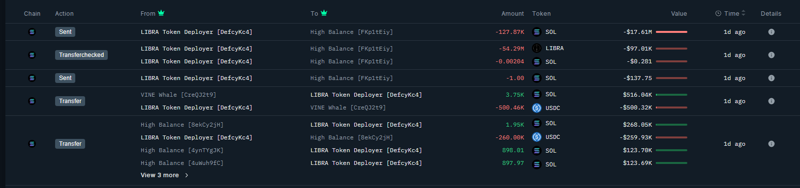Según datos en cadena, dos direcciones vinculadas al proyecto Libra, etiquetadas como "Libra Deployer (Defcy)" y "Libra Wallet (61yKS)", compraron aproximadamente $61.5 millones en SOL a un precio promedio cercano a $135.