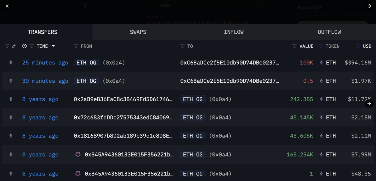Un importante poseedor de Ethereum que había permanecido inactivo durante años, movió repentinamente aproximadamente 200,000 ETH hoy, con un valor de alrededor de $800 millones a los precios actuales.