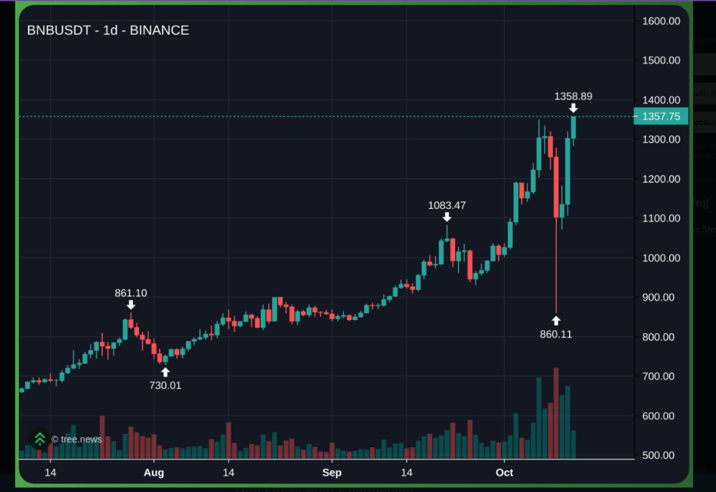 During the market-wide sell-off that followed, BNB dipped back toward $855 but then recovered and surged to the current all-time high of $1,375, before easing to around $1,272 in the latest swings.