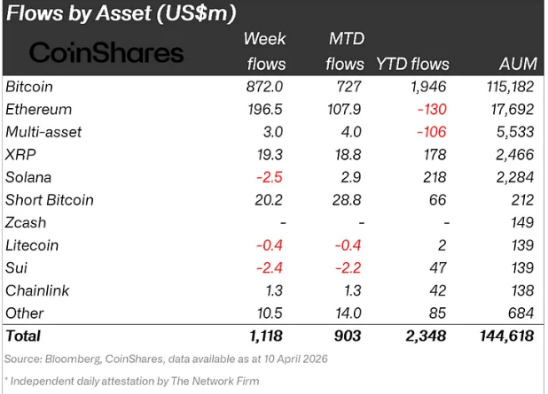 That broader rebound was driven by more than one firm’s market entry. Crypto funds globally attracted $1.1 billion in net inflows for the week ending April 11, according to asset manager CoinShares.