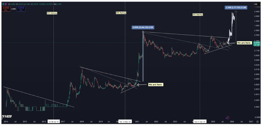 Each halving has always been followed by years of massive upside moves in Dogecoin’s price, with the meme coin breaking out of long-term descending resistance lines to record exponential gains. Examples shown in this chart are the 2017 and 2021 explosive price surges.