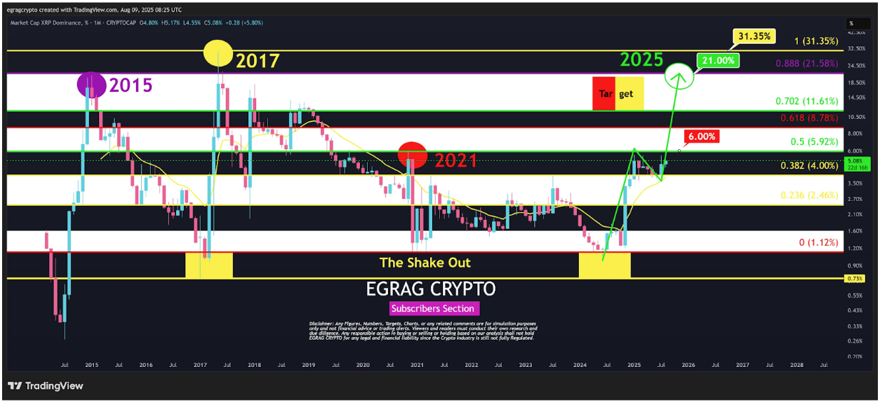 Su análisis basado en Fibonacci identificó el 5.92% de dominio como el primer obstáculo que debe romperse para abrir el camino hacia objetivos más altos. Una vez despejado, la siguiente resistencia está en 8.87%, seguido de su objetivo de dominio óptimo del 11.61%. Si XRP alcanza este objetivo óptimo, certificaría su rendimiento para la criptomoneda en este ciclo. Finalmente, un movimiento al 21.5% de dominio empujaría el precio de XRP a máximos históricos.