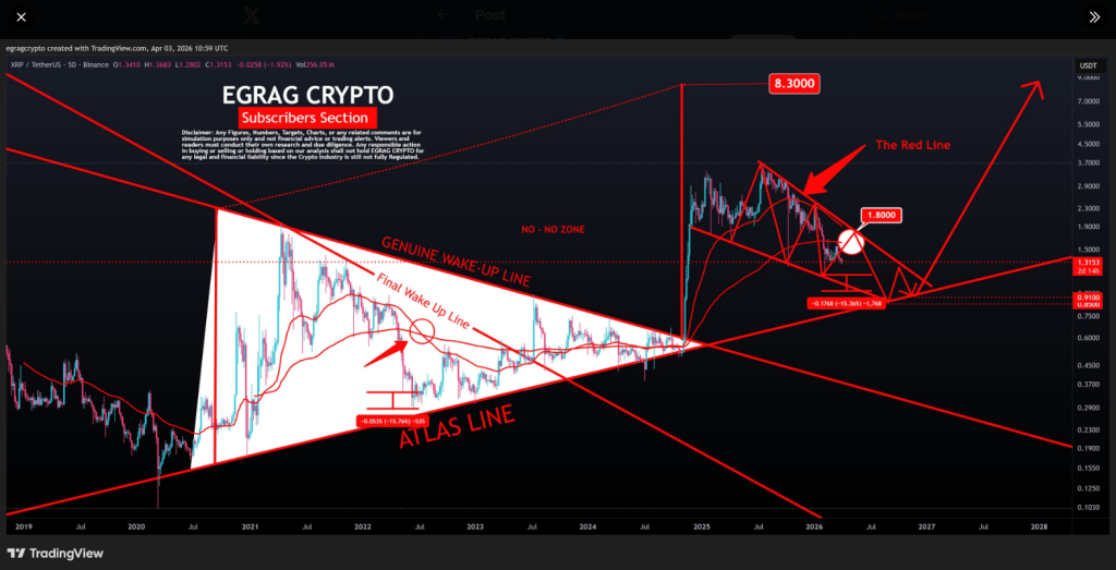 The bullish case has limits. According to Egrag’s analysis, a close above $1.80 on the upper resistance line would break the wedge pattern and cancel the current setup entirely.