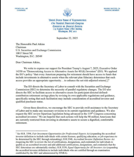 Según cartas enviadas a la Comisión de Bolsa y Valores, nueve legisladores, incluidos los presidentes de los comités de la Cámara, French Hill y Ann Wagner, instaron al presidente de la SEC, Paul Atkins, a actuar sobre una orden ejecutiva del presidente estadounidense Donald Trump que facilitaría a los planes de jubilación la tenencia de criptomonedas. La medida afectaría a aproximadamente 90 millones de estadounidenses que utilizan cuentas 401(k).