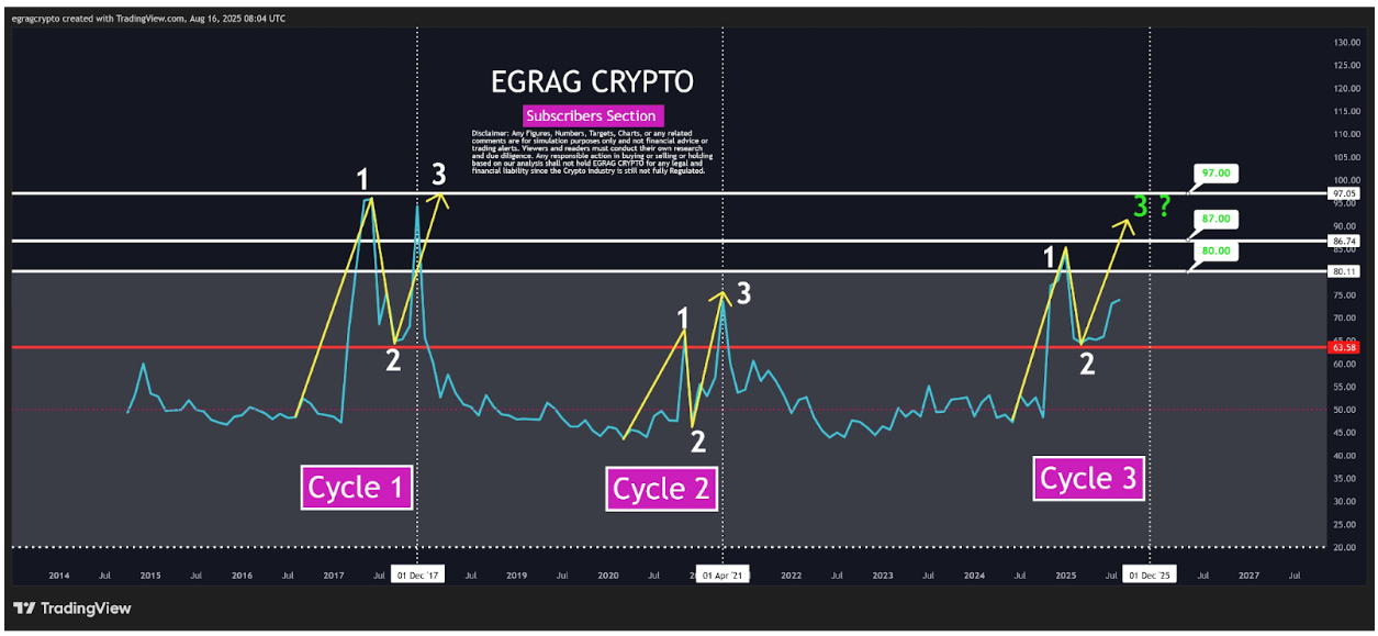 Egrag Crypto predijo tres objetivos posibles de 80, 87 y un ambicioso 97 para el pico mensual del RSI de XRP en el ciclo actual. Estos números se derivan de la trayectoria del RSI observada en los dos últimos ciclos y se proyectan en las condiciones actuales del RSI de XRP.