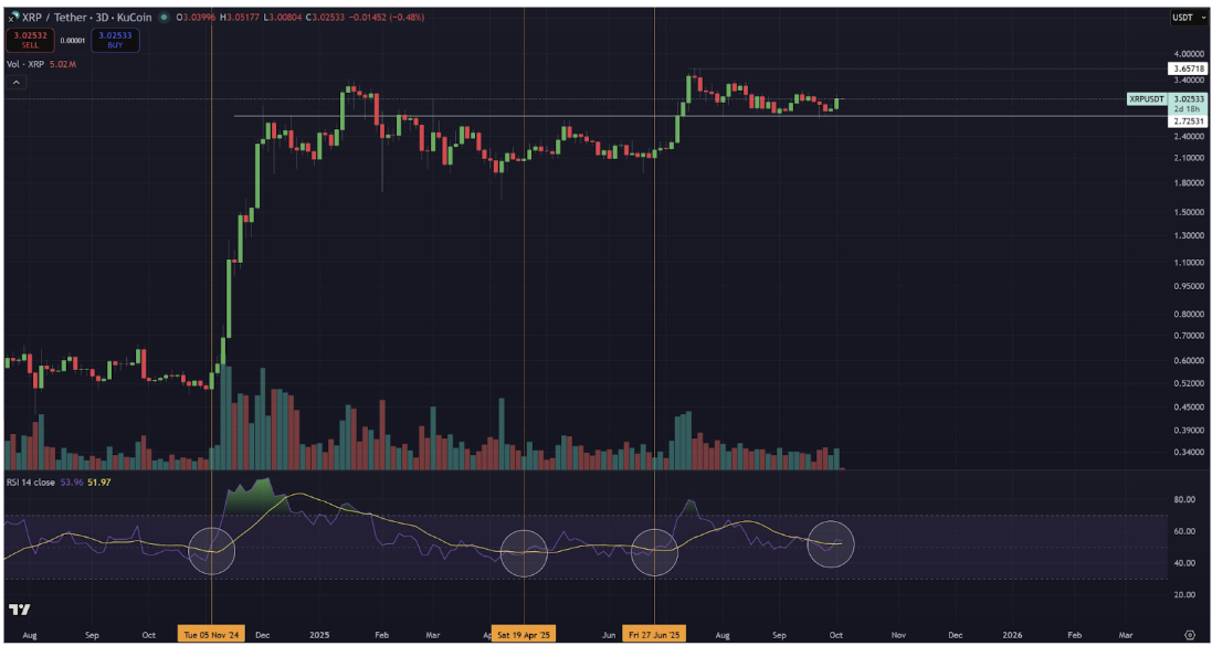 Luego llegó junio de 2025, cuando la misma configuración de RSI y vela apareció por tercera vez después de que XRP cerrara su vela de 3 días por encima de $2.2. Esta resultó ser aún más significativa que la señal de abril, y esto finalmente culminó en un nuevo máximo histórico de $3.65.