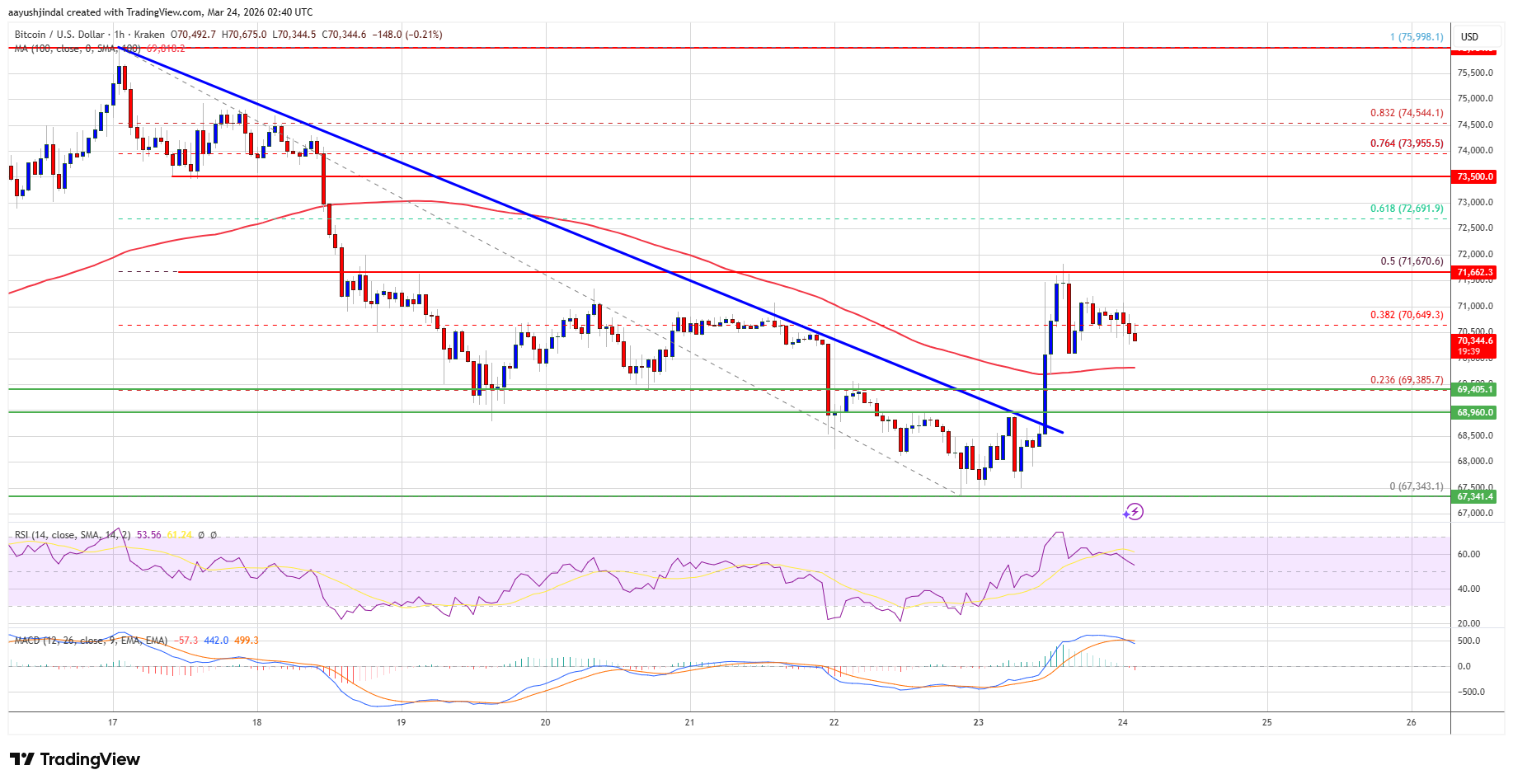Sin embargo, el precio enfrentó resistencia cerca de la zona de $71,500 y el nivel de retracción del 50% de la movida descendente desde el máximo de $75,999 hasta el mínimo de $67,343. Bitcoin ahora está negociando por encima de $70,000 y la media móvil simple de 100 horas.
