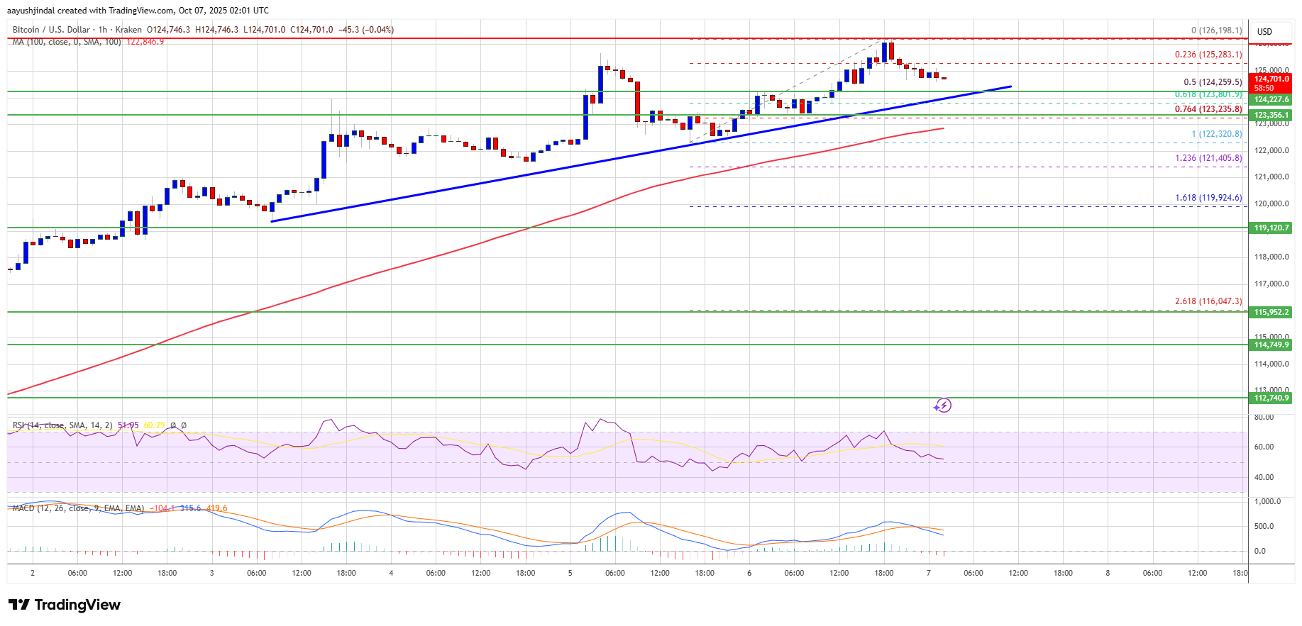 Bitcoin ahora cotiza por encima de $124,000 y la media móvil simple de 100 horas. Además, hay una línea de tendencia alcista a corto plazo que se está formando con soporte en $124,200 en el gráfico horario del par BTC/USD.
