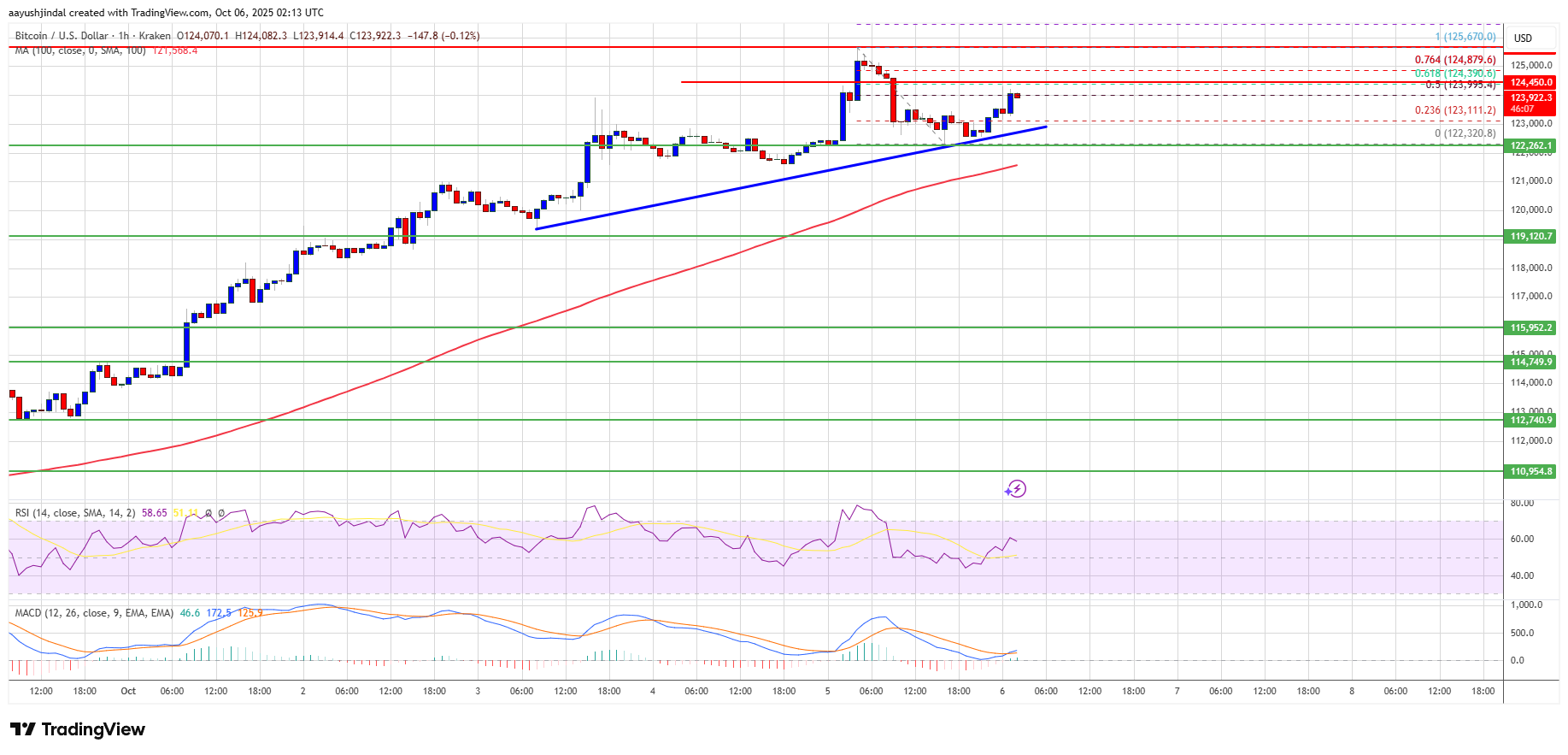 Los alcistas pudieron impulsar el precio por encima de los niveles de $123,500 y $124,000. Incluso superaron el nivel de $125,000. Se formó un máximo en $125,670 antes de que se produjera un retroceso menor a $122,250. El precio vuelve a subir y se cotiza cerca del nivel de retroceso de Fibonacci del 50% de la reciente caída desde el máximo de $125,670 hasta el mínimo de $122,320.