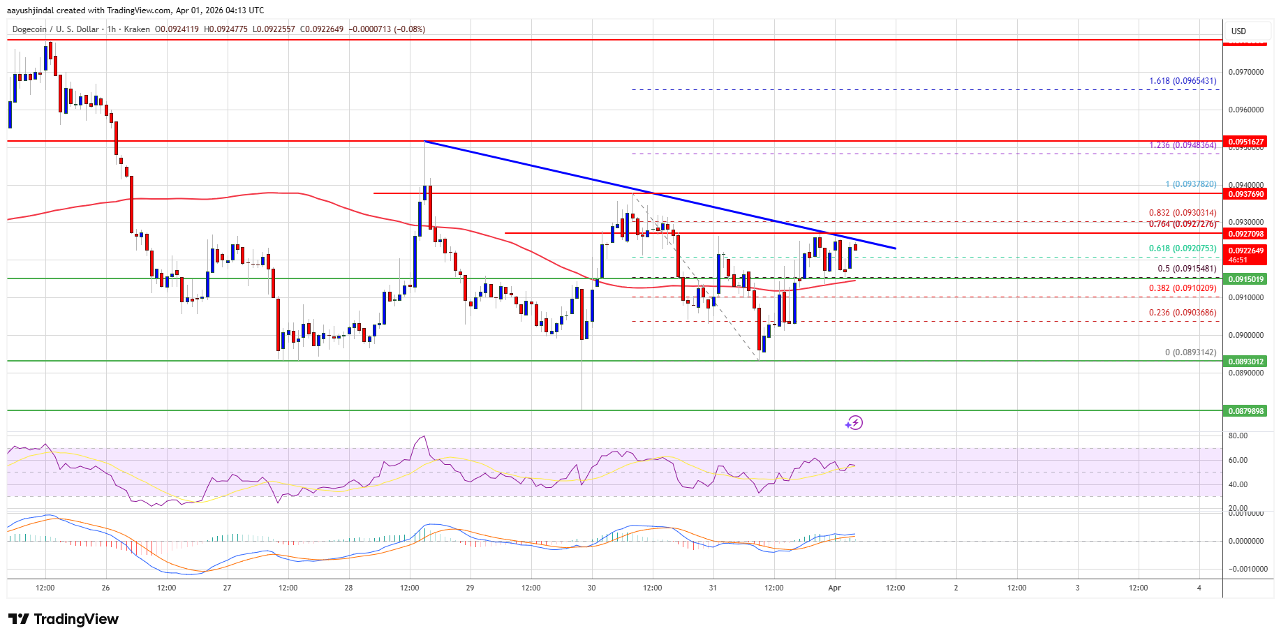 - El precio de DOGE inició una ola de recuperación desde $0,0890 y subió por encima de $0,0920.