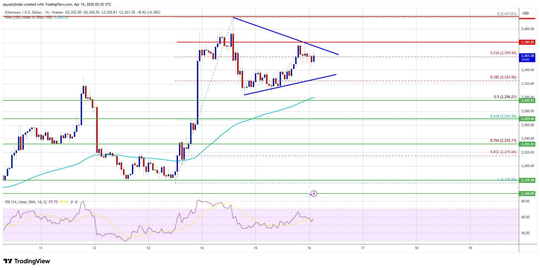 - Hay un triángulo contractivo formándose con resistencia en $2,380 en el gráfico horario de ETH/USD (fuente de datos a través de Kraken).
