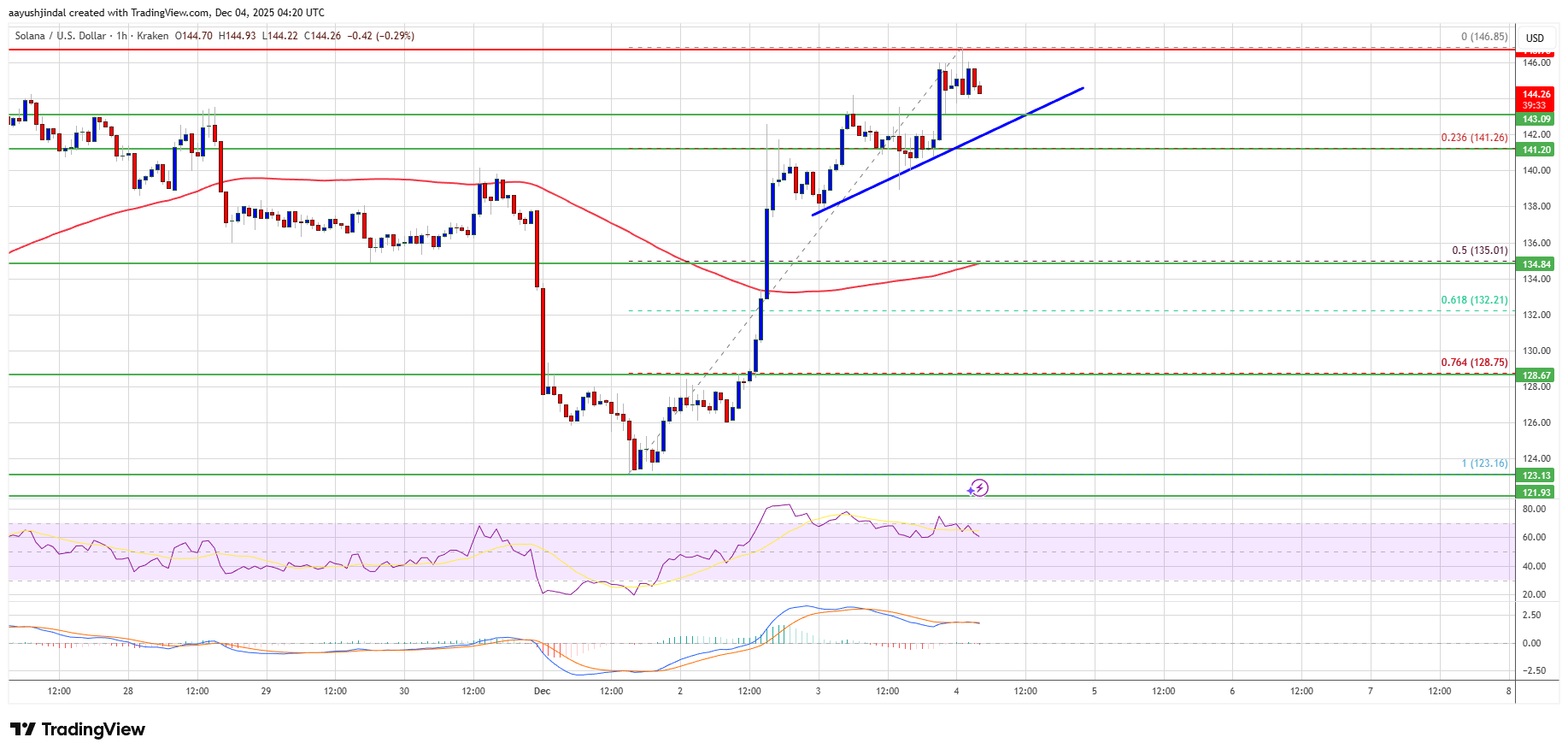 Solana inició un nuevo aumento por encima de la zona de $135. El precio de SOL ahora se está consolidando por encima de $142 y podría apuntar a mayores ganancias por encima de la zona de $145.