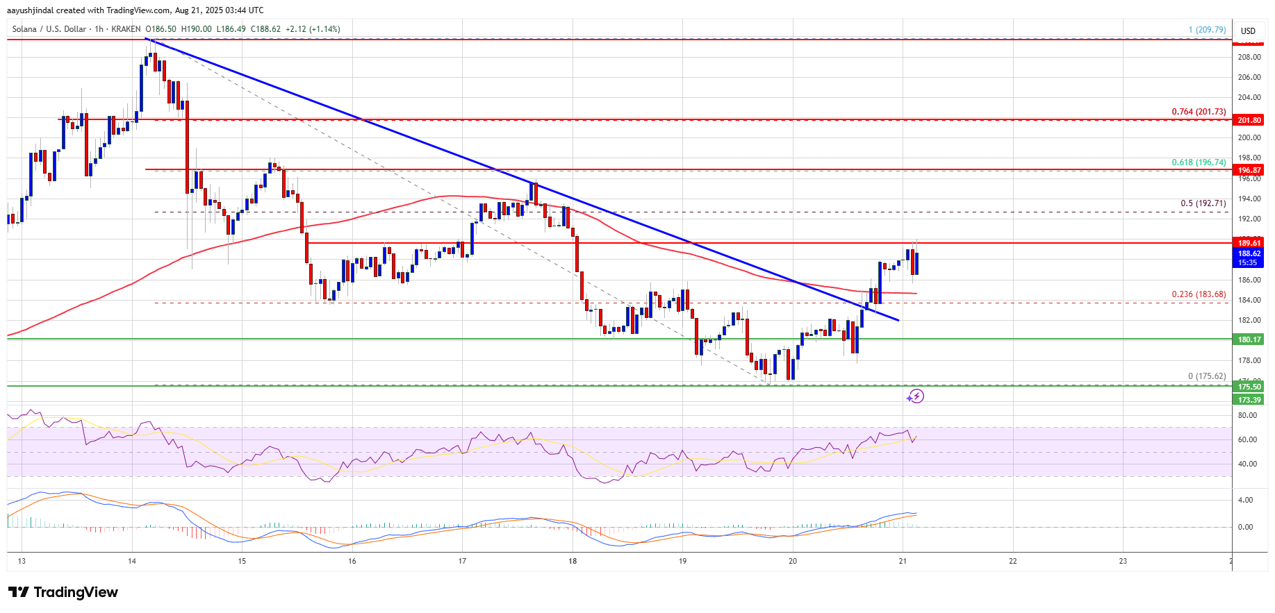 Solana inició un nuevo aumento desde la zona de $175. El precio de SOL ahora se está recuperando y podría apuntar a un movimiento por encima de la zona de resistencia de $188.