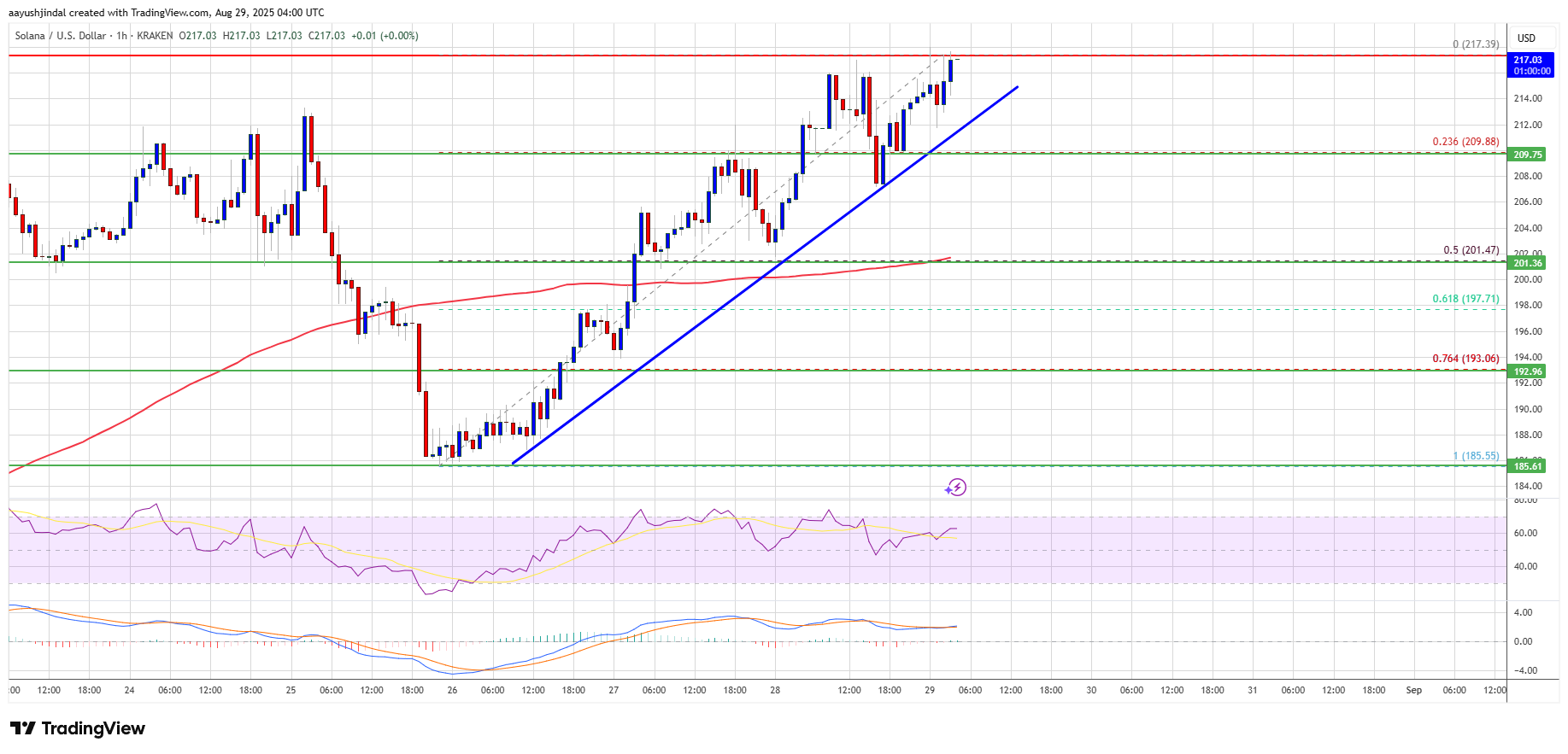 Solana ahora se cotiza por encima de $212 y la media móvil simple de 100 horas. También se está formando una línea de tendencia alcista con soporte en $212 en el gráfico horario del par SOL/USD.