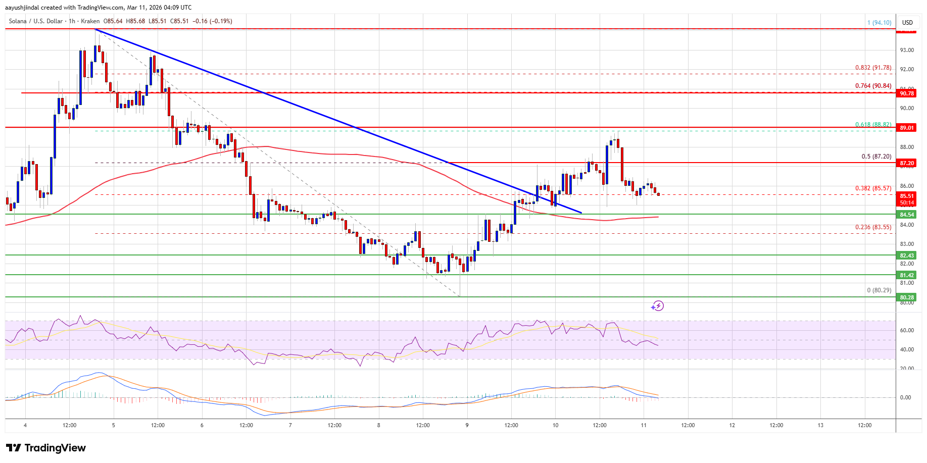 Solana no logró establecerse por encima de $90 y recortó algunas ganancias. El precio de SOL ahora se está consolidando por encima de $85 y muestra algunos signos bajistas.